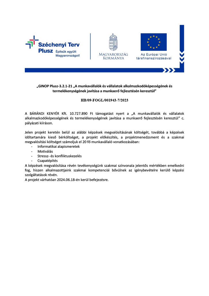 · a projekt címe: Munkahelyi képzések támogatása a Bárándi Kenyér Kft-nél