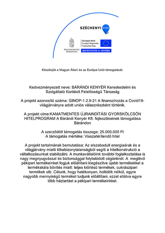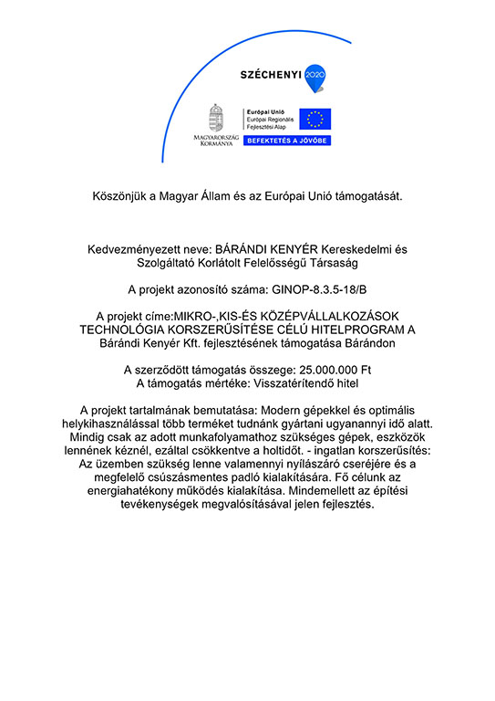 · a kedvezményezett neve: BÁRÁNDI KENYÉR Kereskedelmi és Szolgáltató Kft.
